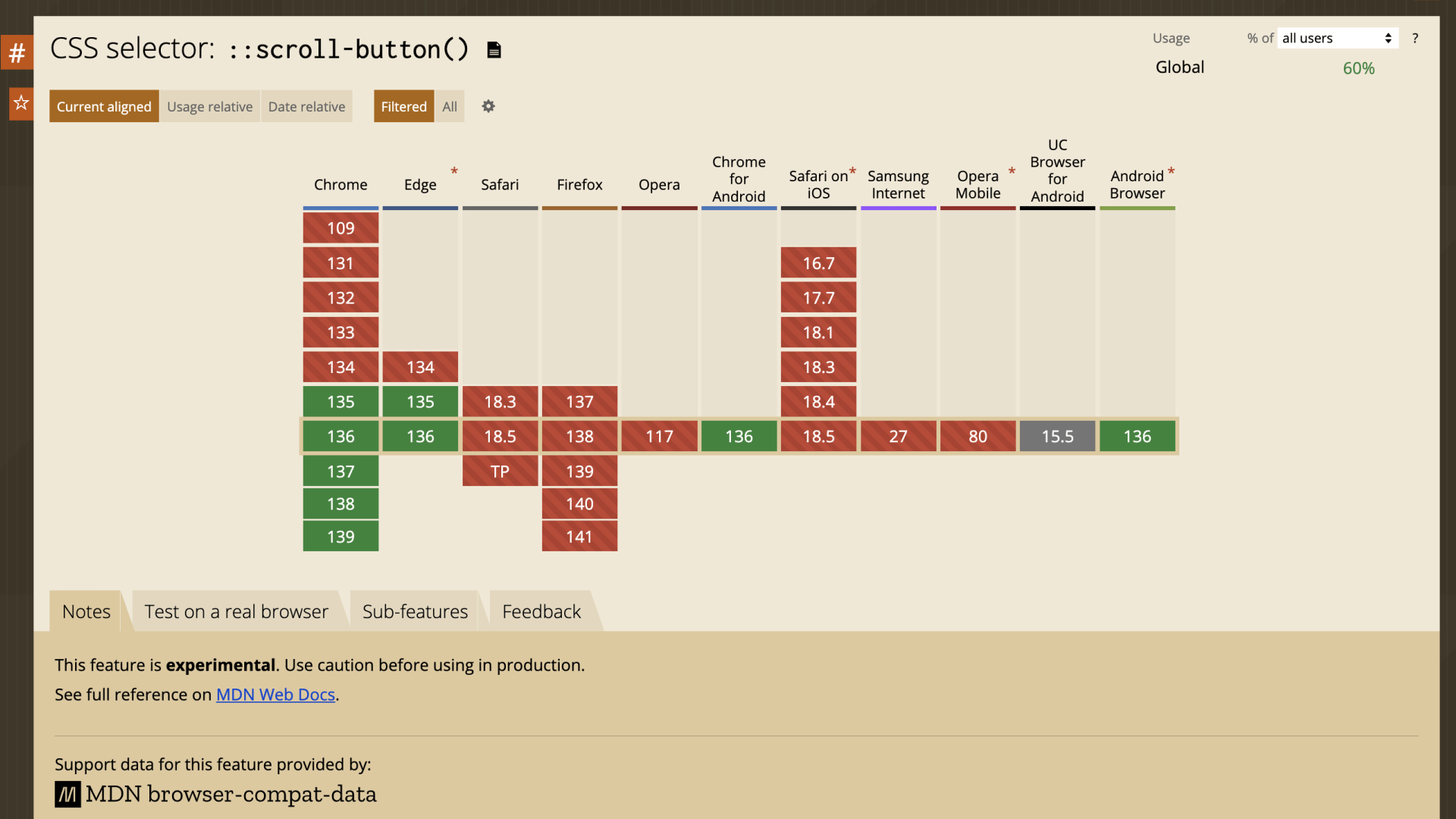 スクリーンショット:Can I use..での::scroll-button()疑似要素の対応ブラウザ状況