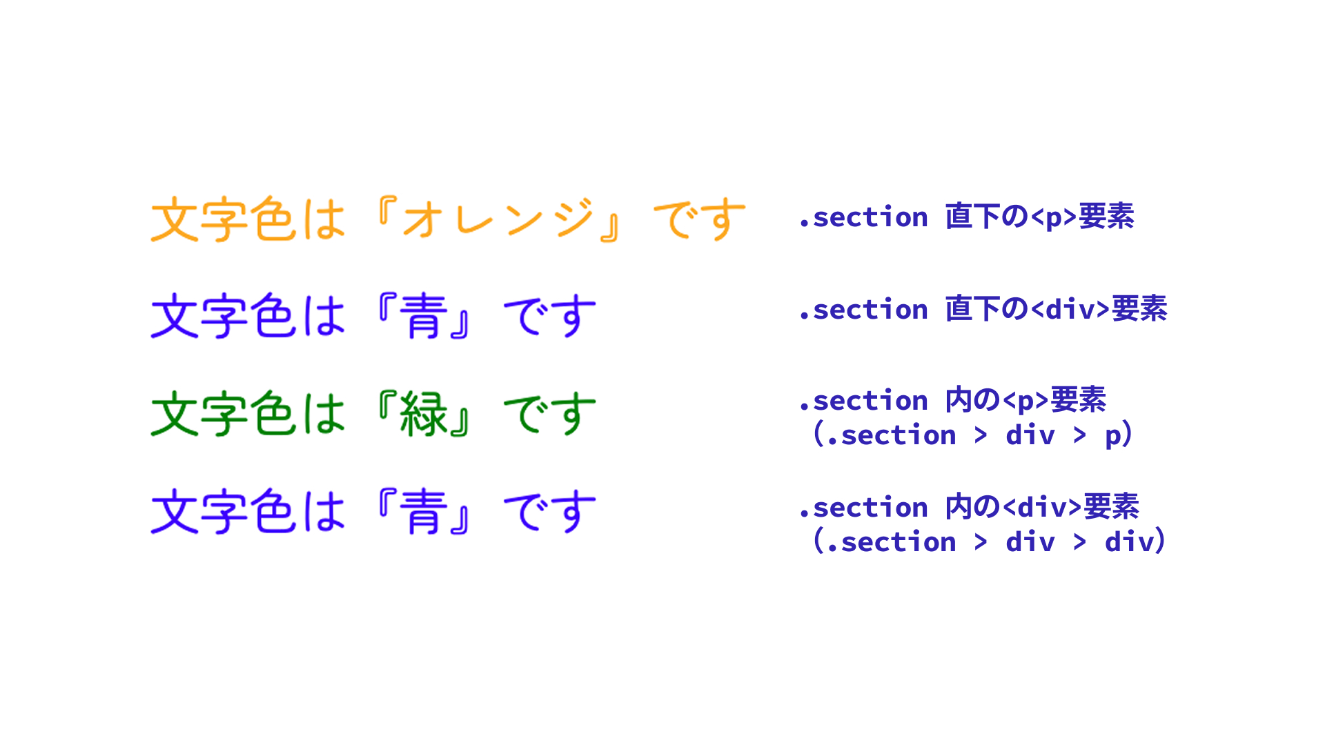 :scope { color: blue; }:.section自体に『青』を指定:scope > p { color: orange; }:.section直下の<p>要素に『オレンジ』を指定p { color: green; }:.section内すべての<p>要素に『緑』を指定(ただし『オレンジ』の指定の方が詳細度が高いため、.section直下の<p>要素は『オレンジ』)