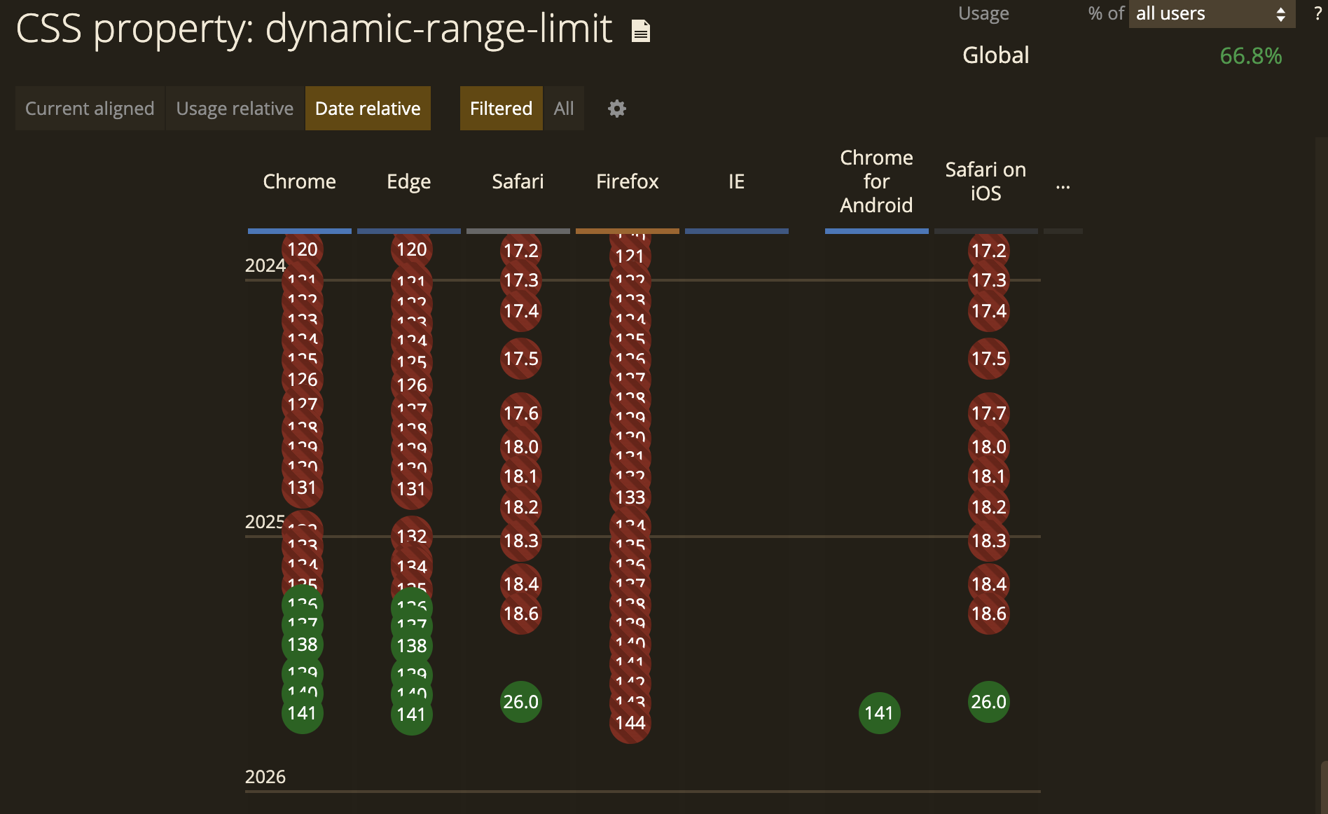 CSSのdynamic-range-limitプロパティはChrome 136(2025年4月)・Edge 136(2025年5月)、Safari 26.0(2025年9月)以上で利用可能です。