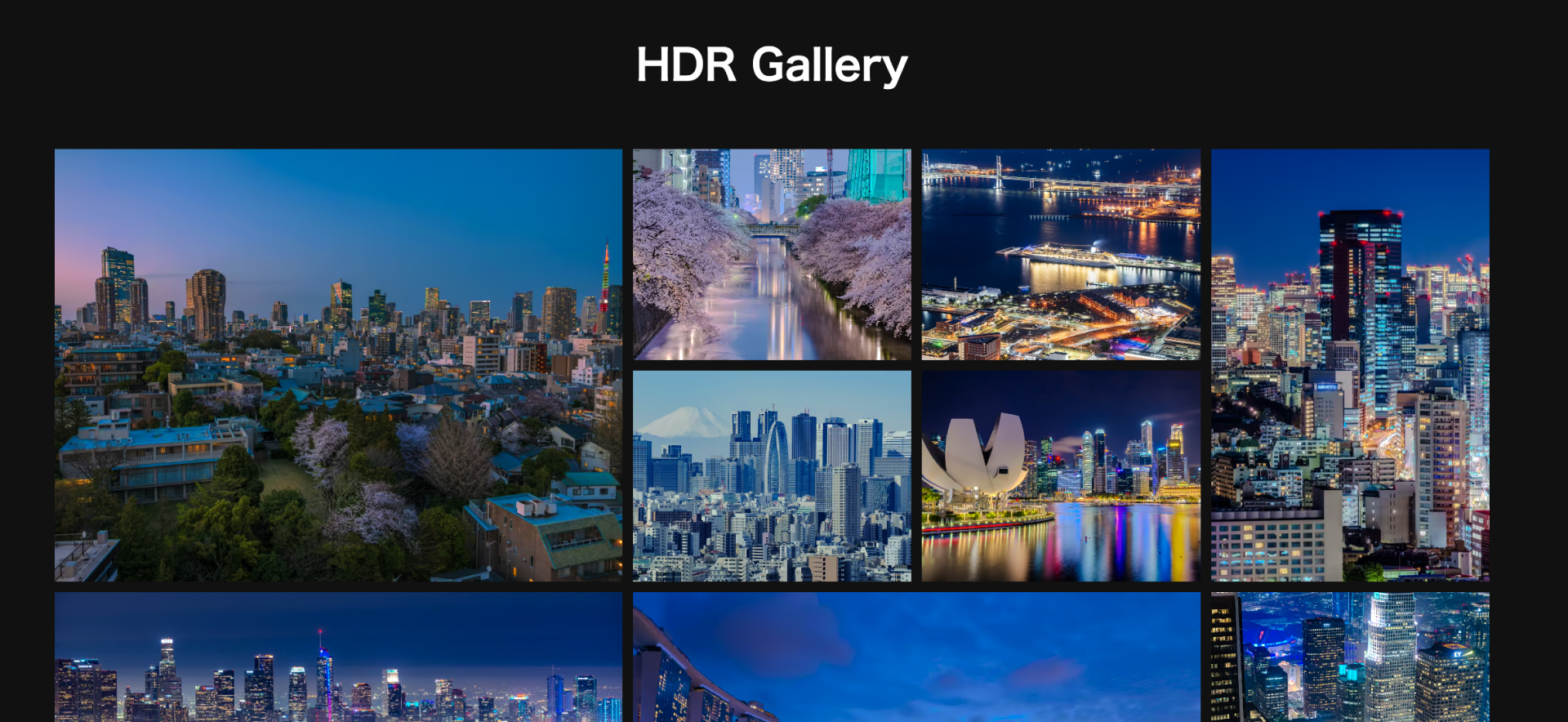 HDRの表示がどのようなものか、体験を得られるオリジナルの写真ギャラリーのデモを用意しました。Chrome・Edge・Safariの最新版で、HDR対応ディスプレイ(例:iPhone Pro等)でアクセスして試してみてください。写真を詳細表示したときに、HDR対応ディスプレイではHDRで表示されます。