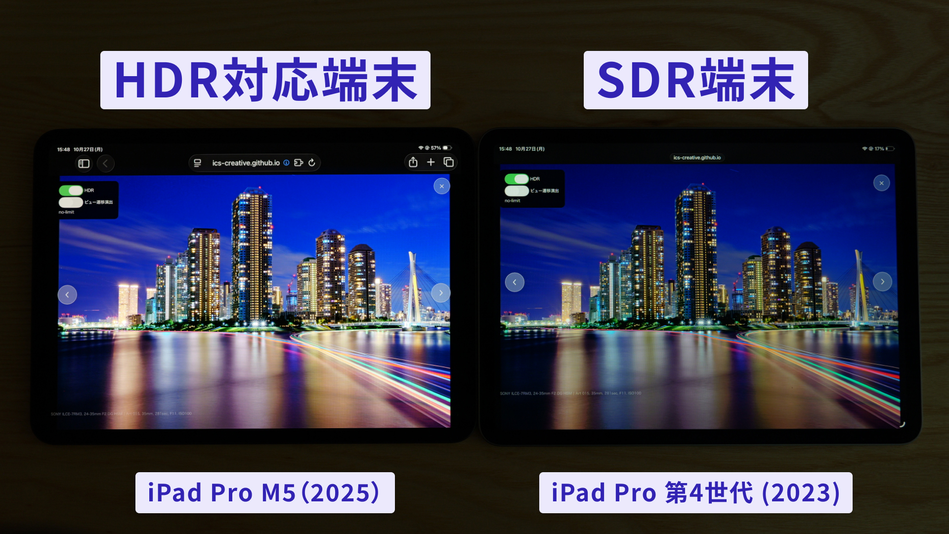 もうひとつ、SDRとHDRを比較可能なデモも用意しました。写真の間の境界線をドラッグして、SDRとHDRの表示を比較してみてください。