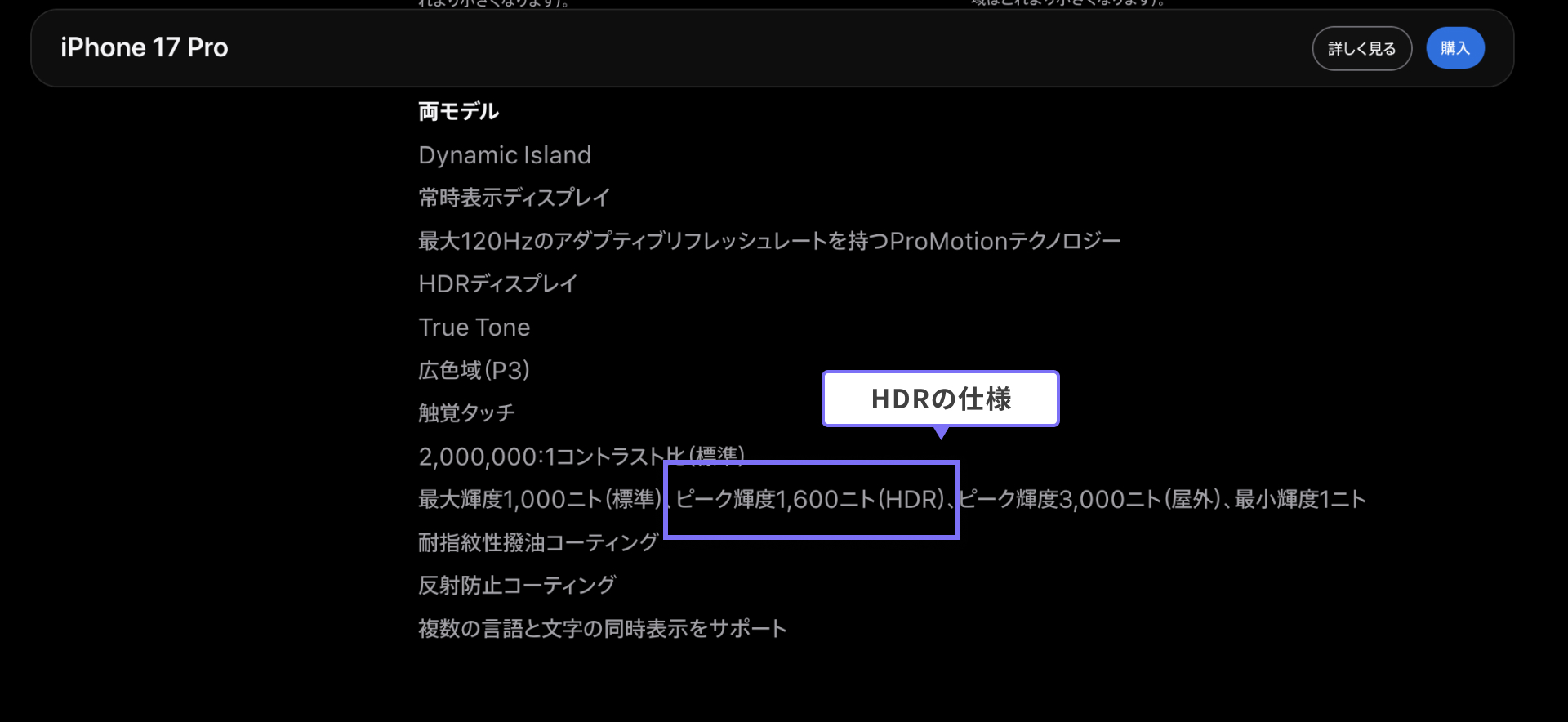 Apple製品は仕様書に「ピーク輝度」という記載があり、これがHDR対応していることを指します。