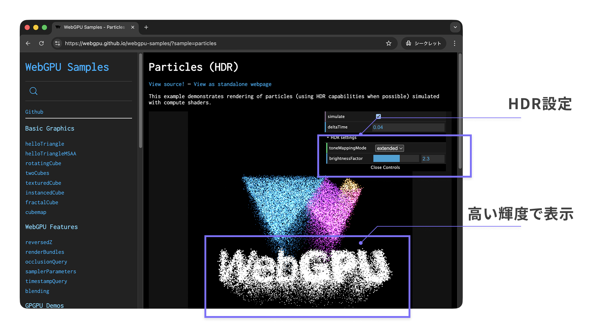 従来のWebGLにはHDR表示はありませんので、HDR表示がWebGLにたいするWebGPUの利点のひとつと言えます。